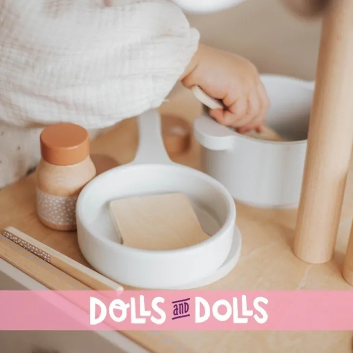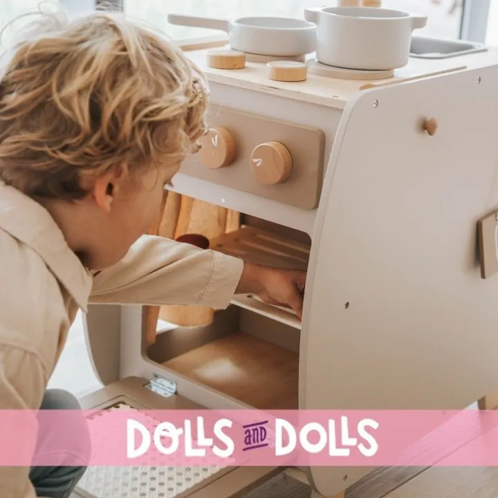 Tu vas t’amuser avec cette belle cuisine en bois ! Tu peux t’amuser à nourrir tes poupées. Qu’est-ce que tu vas leur préparer aujourd’hui ?