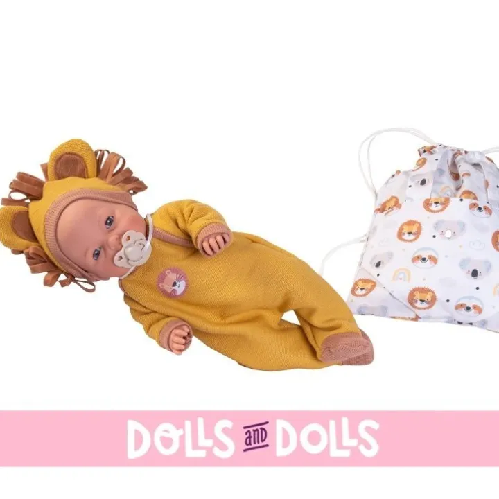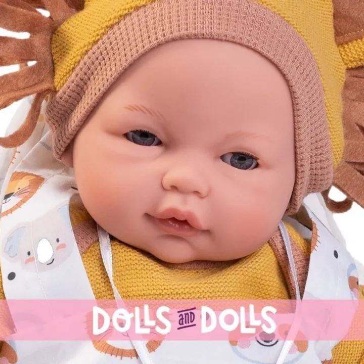 Bimba est une poupée très heureuse ! Elle est très mignonne dans sa grenouillère couleur moutarde et son chapeau de lion. Tu peux l’emmener partout dans son porte-bébé pour faire de grands jeux avec elle. Si tu la mets au lit, elle fermera les yeux comme un vrai bébé. Bimba est une poupée de Muñecas Antonio Juan dotée d’un mécanisme sonore. Lorsque vous lui enlevez sa tétine, elle pleure et appelle ses parents, mais si vous lui remettez sa tétine, elle se calme. Son corps est en tissu doux pour que tu puisses lui faire des câlins et ses membres sont en vinyle doux. Elle mesure 37 cm et pèse 523 g. Mets Bimba dans sa cage de transport et promène-toi avec elle !