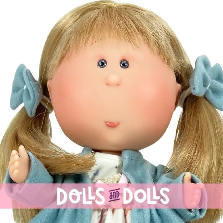 Poupée Nines d'Onil 30 cm - Mia blonde avec une robe arc-en-ciel et un manteau bleu