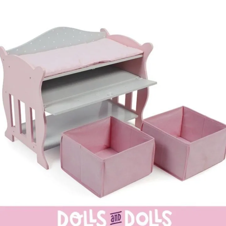 Changez votre poupée avec cette merveilleuse table à langer en bois et ayez ses articles de toilette à portée de main avec les cubes en tissu et l'étagère.