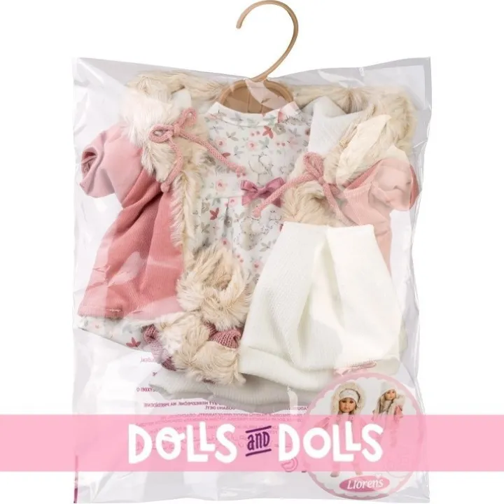 Vêtements pour poupées Llorens 35 cm - Ensemble nature avec veste et chaussettes roses et bonnet blanc